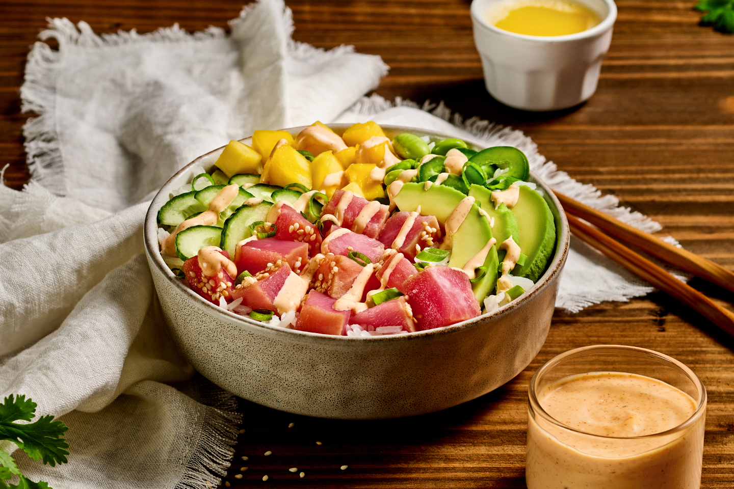 5. Pile it up! Put rice into serving bowls and top with desired toppings. Add extra Florida Citrus Ponzu and drizzle a bit of toasted sesame oil if desired. Top the rice with the chilled tuna. Top with macadamia nuts and drizzle with the creamy Sriracha sauce.